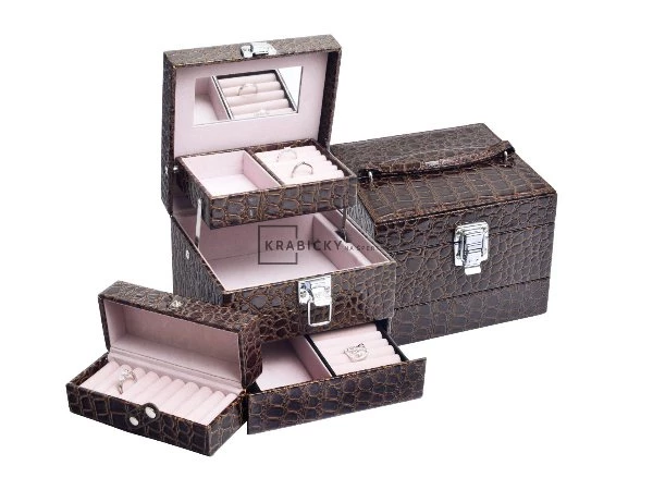 Krásná šperkovnička na vaše šperky. Přiložena i cestovní šperkovnička,takže své šperky můžete mít vždy u sebe pěkně uložené Rozměr: 154x154x127 Barva: hnědá Dvouletá záruka