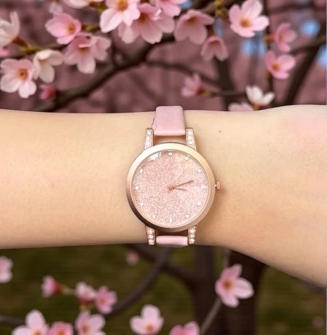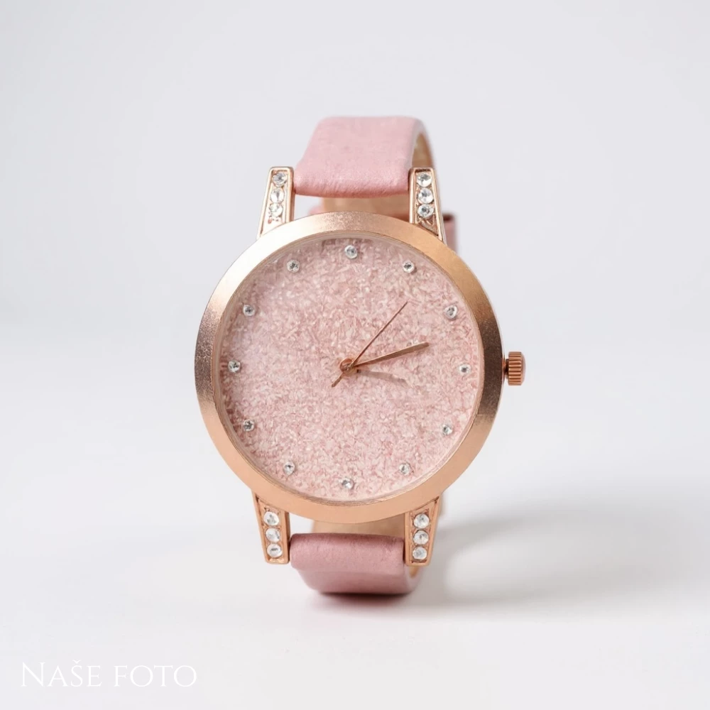 Matné pouzdro v odstínu rosegold krásně kontrastuje s jemně třpytivým ciferníkem, který doplňují drobné kamínky místo číslic.