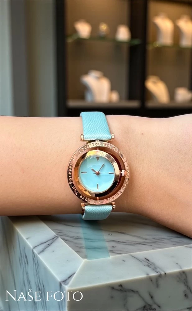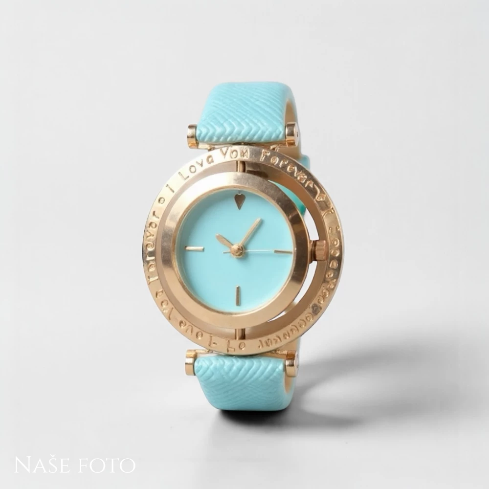 Zlaté pouzdro nese nápis „I love you forever“ a ukrývá otočný ciferník, který lze lehce pootočit – drobný detail, který z hodinek dělá stylový a hravý doplněk.