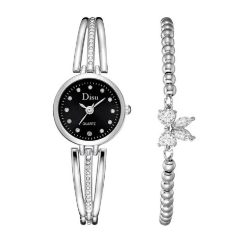 Hodinky značky Disu mají černý ciferník zdobený čirými kamínky a tenké kovové pásky s jemnými detaily. Skvěle ladí s náramkem ve stejném tónu – zdobeným motýlkem z broušených kamínků.