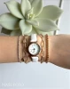 Bílé hodinky s římskými číslicemi a zlatým pouzdrem doplňuje sada náramků v různých stylech – jemně zdobený kamínky, článkový i hladký.