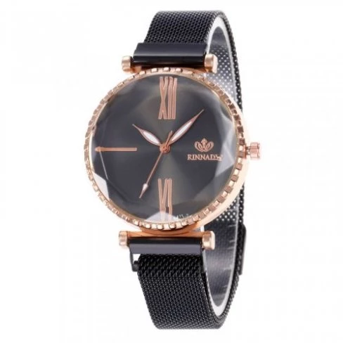 Dámské hodinky v elegantním provedení, v černé barvě, pouzdro v gold rose. Ciferník zdoben římskými číslicemi.