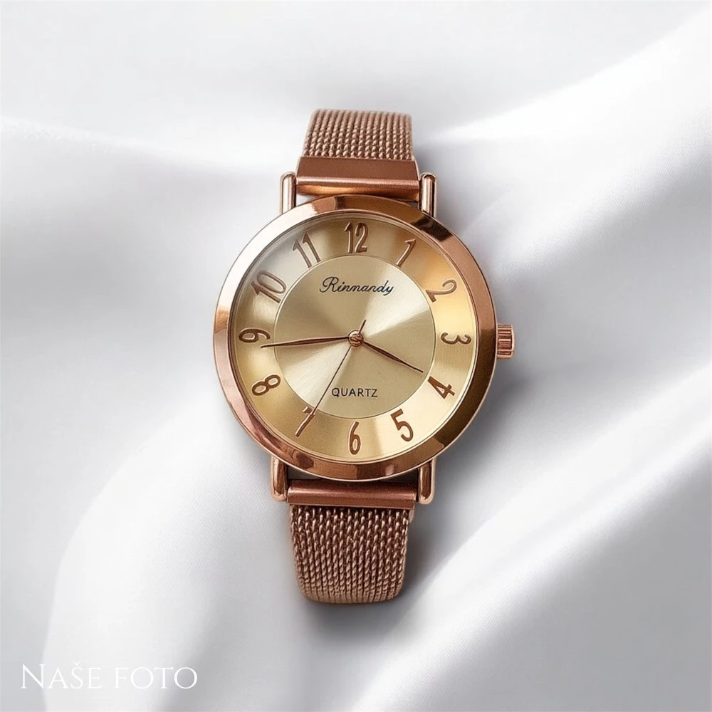 Dámské hodinky Golden Rose kombinují klasický styl s moderní elegancí. Zlatý ciferník s logem Rinnandy a výraznými čísly zajišťuje snadnou čitelnost, zatímco rosegold rám a kovový magnetický řemínek dodávají hodinkám ženský půvab.