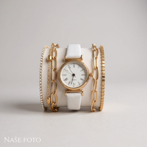 Bílé hodinky s římskými číslicemi a zlatým pouzdrem doplňuje sada náramků v různých stylech – jemně zdobený kamínky, článkový i hladký.