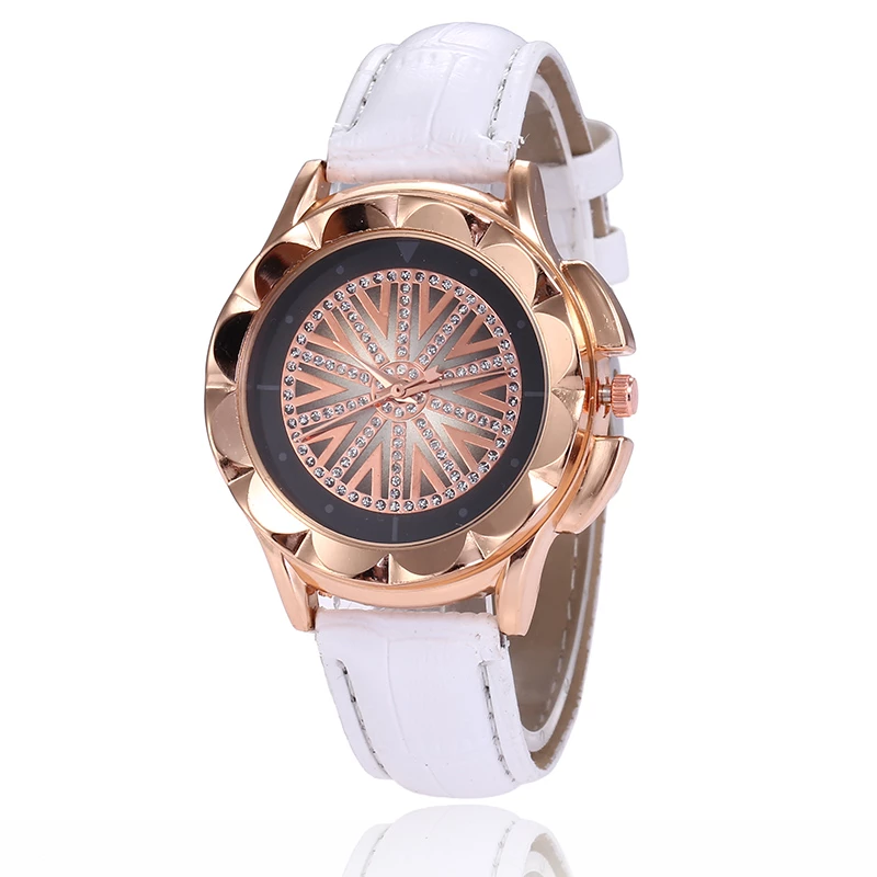 Dámské moderní hodinky, v bílém provedení. Ciferník je v černé barvě zdobený čirými zirkony bez číslic. Pásek kožený, vzorovaný.