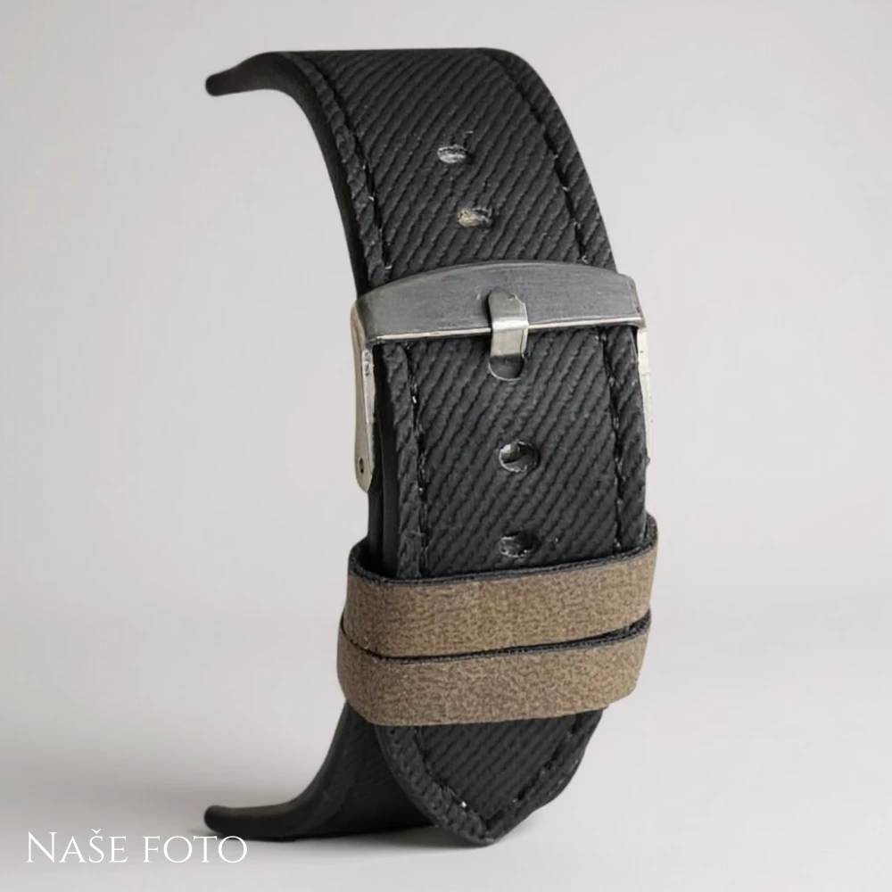 Matně černé pouzdro působí robustně, zatímco hnědý pásek dodává teplý a přirozený vzhled.