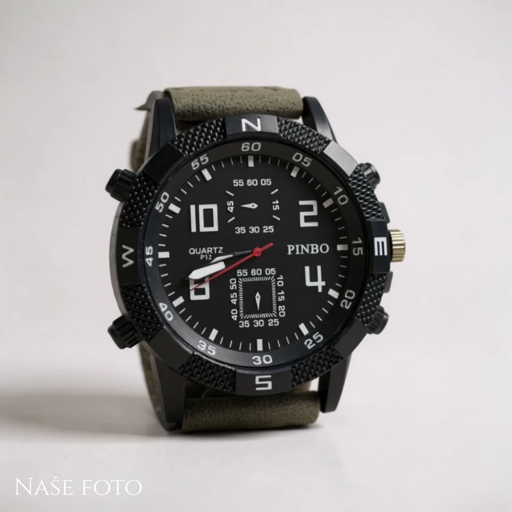 Khaki verze PINBO Sport kombinuje outdoorový nádech s městským stylem. Velká čísla, robustní luneta a pohodlný koženkový pásek dělají z tohoto modelu spolehlivý doplněk do práce i na volno.