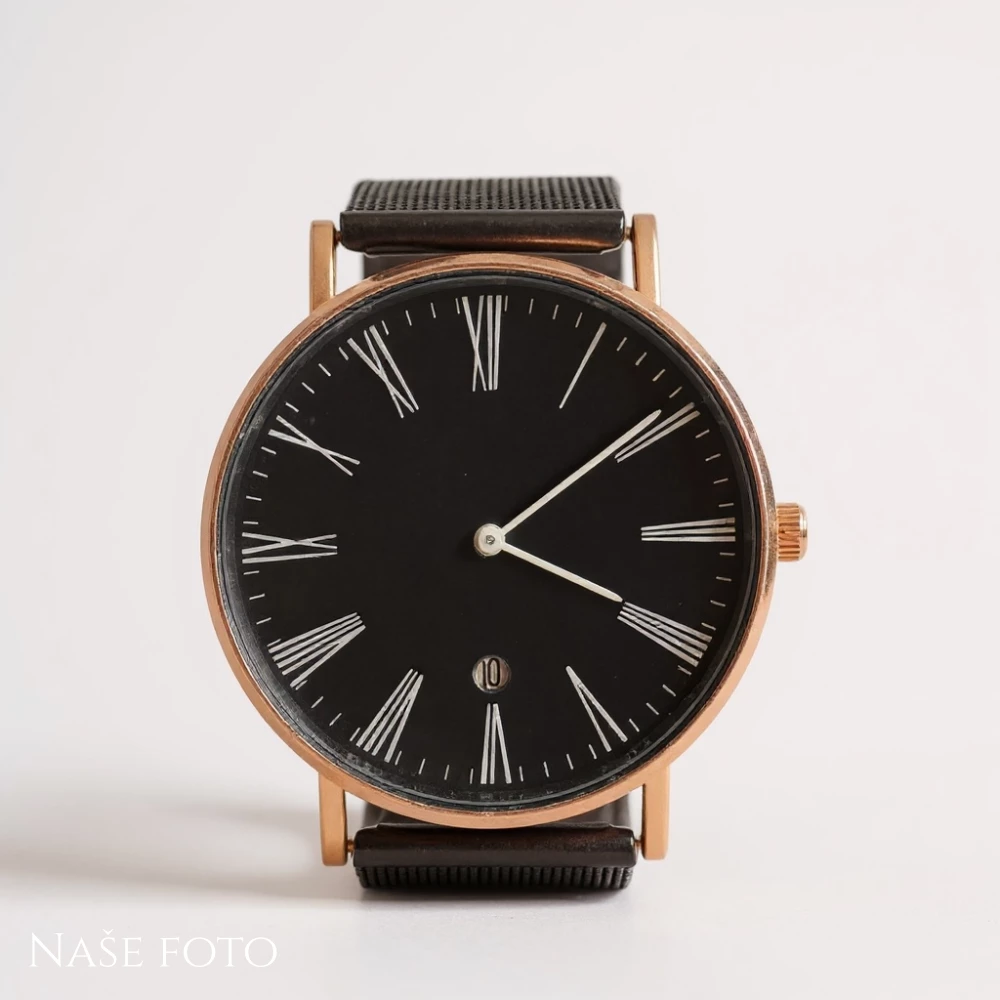 Ciferník s římskými číslicemi působí klidně, elegantně a přehledně, zatímco černý řemínek z koženky dodává hodinkám univerzální vzhled.