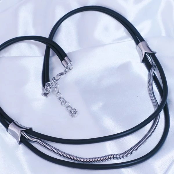 Moderní dámský kaučukový náhrdelník , je kombinovaný s hadovým řetízkem o šířce 5mm. Šířka kaučukových provázků 5mm. Délka nastavitelná od 65cm do 72cm 424