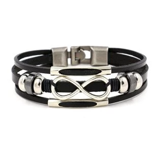 Kožený náramek se symbolem ležaté osmičky - nekonečno Náramek je vyroben z umělé kůže a bižuterie Parametry materiál obecný kov, syntetická kůže povrchová úprava lesklá délka náramku 21 cm šíře náramku 10 mm