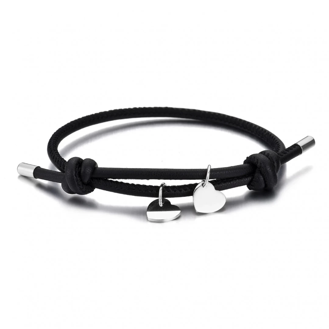 Tento krásně zpracovaný černý náramek je vyrobený z kvalitní systetické kůže a je doplněný dvěma nerezovými přívěsky ve tvaru srdíček s vysoceleštěným povrchem.