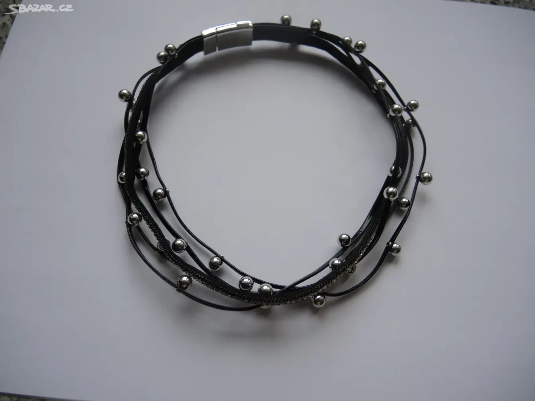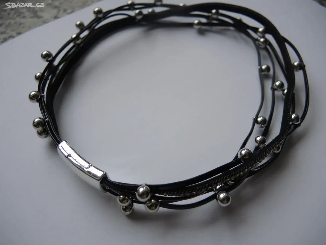 Náramek z Umělé Kůže černý zdobené lesklými kuličkami a drobnými štrasovými kamínky