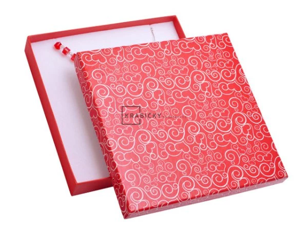 Červená papírová krabička se vzorem srdíček bez mašle na velkou sadu VE-10-A7. Rozměr: 150x150x27 mm.