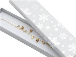 Vánoční papírová dárková krabička na soupravu šperků Dárková krabička je vyrobena z bílého papíru a její víčko je zdobeno stříbrným vánočním dekorem Parametry rozměr 45 x 203 x 23 mm