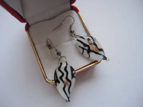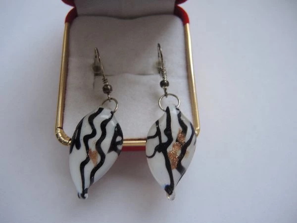 Náušnice ze skla . Kapky v barvách zlatavé, černé a bílé. Každý kousek je originál! Rozměr kamene 17mmx29mm Celková délka i se zapínáním 50mm