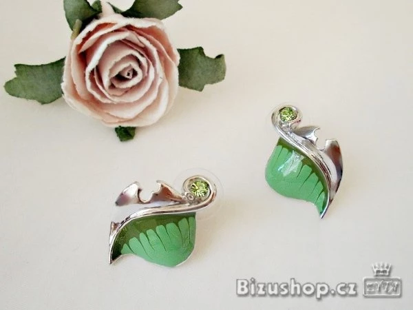Krásně propracované náušnice ve tvaru listů. Zdobeno povrchovou barvou v odstínech zelené barvy a zelenými kameny. Galvanická úprava: rhodium Druh zapínání puzeta