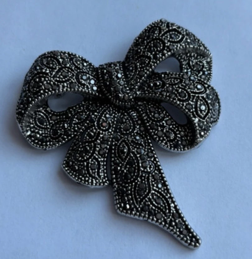 Krásná elegantní brož ve tvaru mašličky zdobená jemnými stříbrnými kaminky