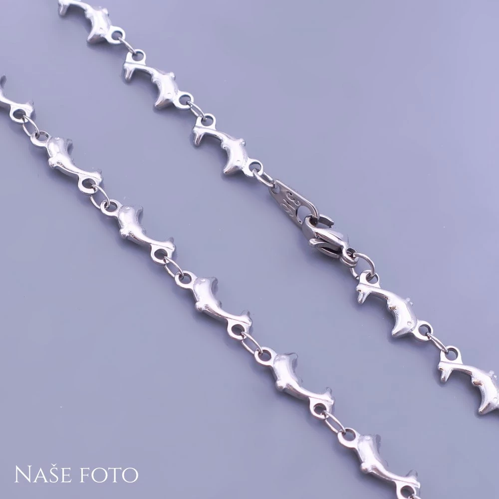 Náramek z vysoce leštěné chirurgické oceli složený z oboustranných delfínů.
