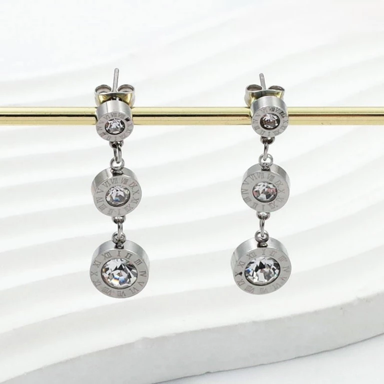 Náušnice visací Chirurgická Ocel stříbrné . Kruhy jsou zdobené kamínky a římskými číslicemi. Šperk Chirurgická ocel.Cenově dostupný. Oblíbený pro svoje vlastnosti. Odolnost proti korozi. Barevná stálost.Vyjímečná tvrdost.Plnohodnotně nahradí drahé kovy.