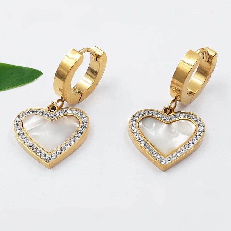 Krásné ocelové náušnice ve zlaté barvě chirurgické oceli. Náušnice zdobené skleněnými kameny ve střední části přírodní bílá perleť. Originální šperk.