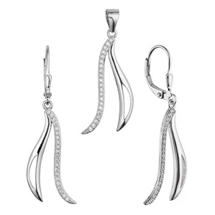 Elegantní sada šperků inspirovaná ladností vln – nadčasová kombinace lesklého stříbra a třpytivých zirkonů dodává těmto kouskům jemný vzhled. Každý šperk v sadě zdobí jemně tvarovaná vlnka, která symbolizuje pohyb, harmonii a eleganci. Přívěsek, dodávaný bez řetízku, vynikne na jakémkoli typu řetízku dle vašeho výběru. Perfektní volba pro milovníky výrazného designu. Skvělý dárek pro každou příležitost.