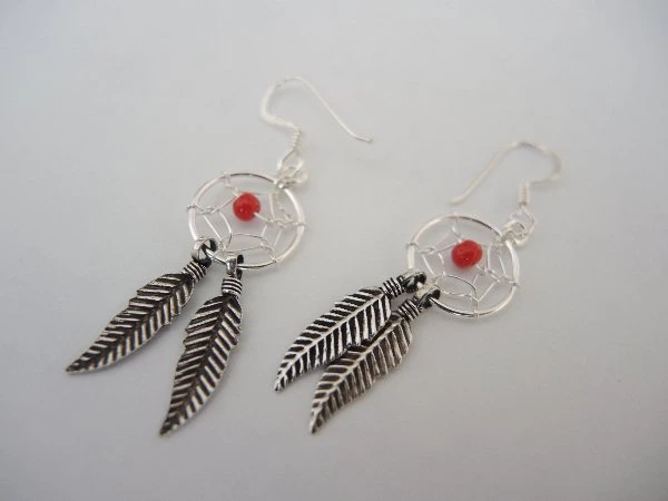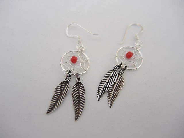 Náušnice ze stříbra 925, lapač snů vypletený tenkým drátkem, patinovaná pírka a tmavě červená kulička. Náušnice visí na afrických háčcích. Průměr kruhu: 12 mm Rozměry náušnic: 12 x 28 mm Hmotnost náušnic: 1,6 g Puncováno - ano.