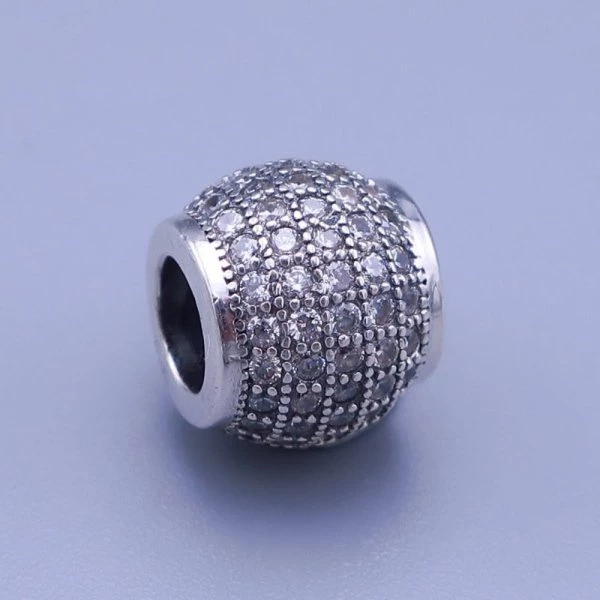 Stříbrný 925 korálek se zirkony Šířka korálku 9mm, průměr korálku 10mm, vnitřní průměr otvoru 5mm. Váha korálku 3g Povrchová úprava rhodiem zabraňuje oxidaci a dává šperku vzhled bílého zlata SK3