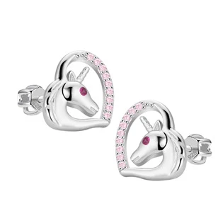 Dětské náušnice ve tvaru srdíček. Okraj náušnic je dekorován kubickými zirkony čiré barvy a ze středu náušnic jednorožec