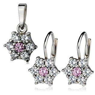 Stříbrný set náušnice + přívěšek Šperky jsou zdobené čirými a růžovými zirkony Šperky jsou vyrobeny ze stříbra s jakostním označením 925-1000 a povrchově upraven rhodiováním materiál stříbro (Ag 925-1000) povrchová úprava rhodium rozměr kytiček 8 mm výška náušnic 15 mm
