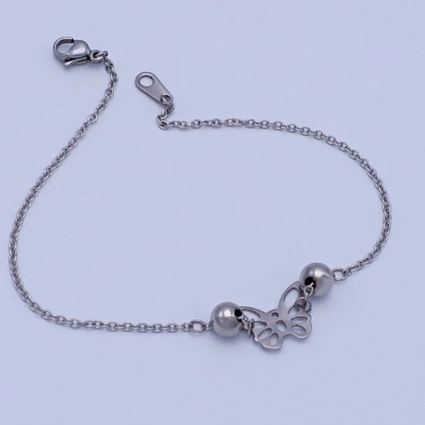 Jemný náramek z leštěné chirurgické oceli se skládá z řetízku 1.2mm, Který zdobí motýlek 13mm a kuličky 6mm. Délka na výběr od 12-13-14-15-16-17-18-19cm Náramek je vhodný pro děti ale také pro ženy, keré mají v oblibě jemné šperky. Chirurgická ocel je vhodná pro alergiky na běžné kovy. 1235