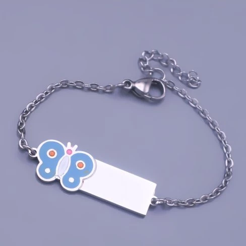 Dětský náramek z chirurgické oceli s destičkou na kterou je možnost gravírování textu.