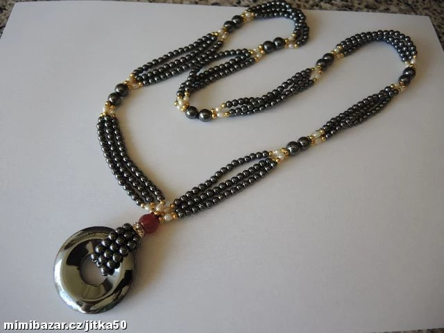 Nádherný výrazný šperk. Kombinace hematitu, bílých perliček a karneolu.