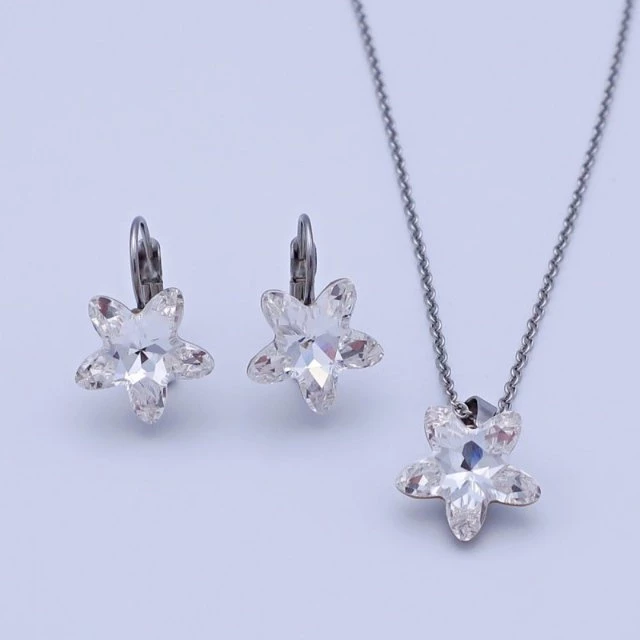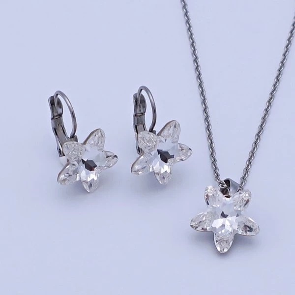 Souprava z chirurgické oceli se skládá z kytiček Swarovski v barvě crystal ( čirá ). Velikost kytiček 14mm. Zapínání náušnic je z chirurgické oceli na klapku. Celková délka náušnic 18mm. Přívěsek kytička je zavěšen na řetízku z chirurgické oceli o šířce 2mm. Délka na výběr od 40-45-50-55-60cm Souprava je uložená v krabičce. S71
