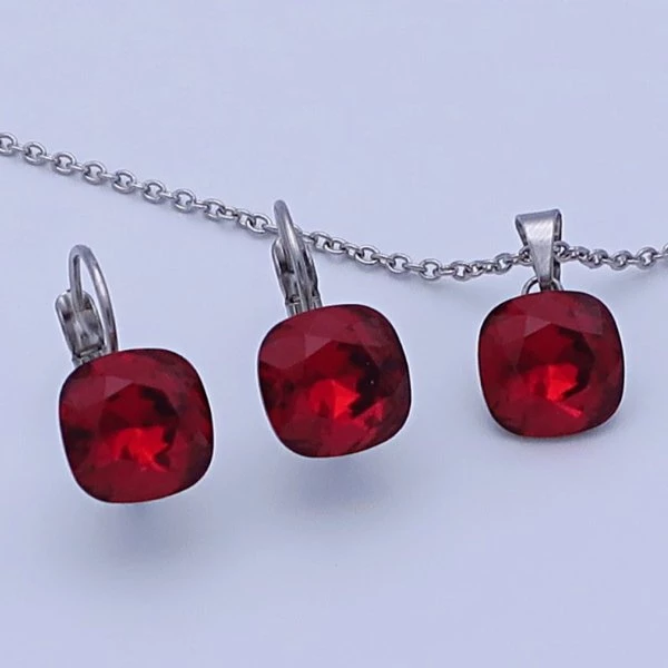 Souprava z chirurgické oceli se skládá z krystalů o veikosti 10mm v barvě scarlet ( červená ). Náušnice z chirurgické oceli se zapínáním na klapku jsou zdobené krystalem 10mm s výrazným brusem. Celková délka náušnic se zapínáním 18mm. Přívěsek je zavěšen na řetízku z chirurgické oceli o šířce 2mm. Délka na výběr od 40-45-50-55-60cm Souprava je uložená v krabičce. S82