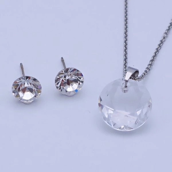 Souprava z chirurgické oceli je složená z krystalů Swarovski v barvě Crystal ( čirá ). Puzetové náušnice z chirurgické oceli zdobí swarovski crystal s výrazným brusem o velikosti 8mm. Přívěsek Swarovski o průměru 14mm je zavěšen na řetízku z chirurgické oceli, o šířce 2mm. Délka na výběr od 40-45-50-55-60cm Souprava je uložená v krabičce. S73