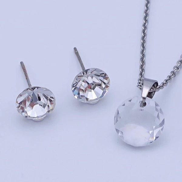 Souprava z chirurgické oceli je složená z krystalů Swarovski v barvě Crystal ( čirá ). Puzetové náušnice z chirurgické oceli zdobí swarovski crystal s výrazným brusem o velikosti 8mm. Přívěsek Swarovski o průměru 10mm je zavěšen na řetízku z chirurgické oceli o šířce 1,2mm, který si můžete vybrat z délek od 40-45-50-55-60cm Souprava je uložená v krabičce. S72