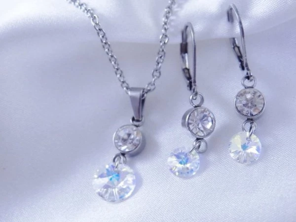 Jemná souprava z chirurgické oceli je složená ze Swarovski koleček ,které máme na výběr v barvě : Crystal AB ( měnící ) , Náušnice jsou složeny z koleček 6mm které jsou zavěšeny na zirkonu v barvě Crystal 6mm a jsou zavěšeny na zapínání z chirurgcké oceli na klapku. Celková délka náušnic se zapínáním : 30mm Přívěsek je složen z kolečka 8mm a zirkonu 6mm o celkové délce 24mm je uchycen na očkovém řetízku z chirurgické oceli o šířce 1mm ,který si můžete vybrat z délek od 40-45-50-55-60cm Souprava je vhodná také pro děti od 6 let a je uložena v originál dárkové krabičce . Chirurgická ocel je vhodná pro alergiky na běžné kovy. Kód 00118