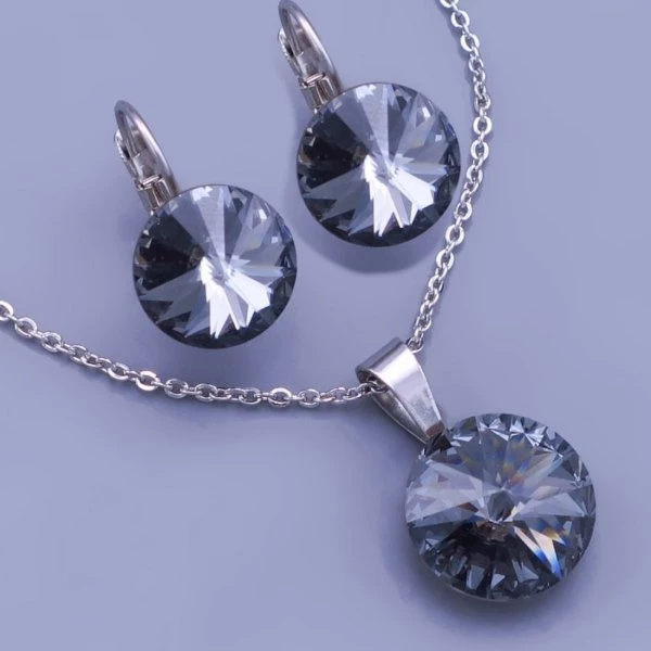 Oblíbená souprava rivoli ( kolečka ) je v barvě Silver Night ( Šedočerná efekty ) Náušnice : Rivoli o velikosti 12mm jsou uchyceny na zapínání z chirurgické oceli na klapku. Přívěsek o velikosti 14mm je uchycen na na řetízku z chirurgické oceli který dáváme k soupravám zdarma. Můžete si vybrat ze dvou variant šířky 1mm a 2mm, a délky od 45cm do 55cm. Souprava je uložena v originál dárkové krabičce . 00073