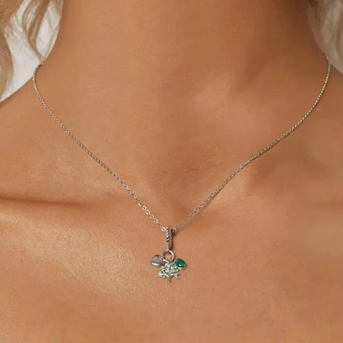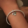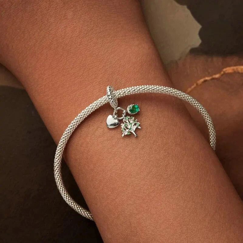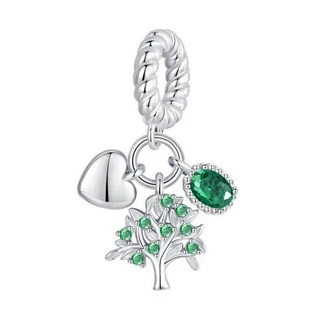 Stříbrný přívěšek korálek na náramek dekorovaný zirkony zelené barvy a třemi přívěšky v podobě strom života, srdíčko a zelený kamínek.