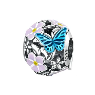 Stříbrný přívěšek korálek na náramek zdobený tematikou motýlků a květin