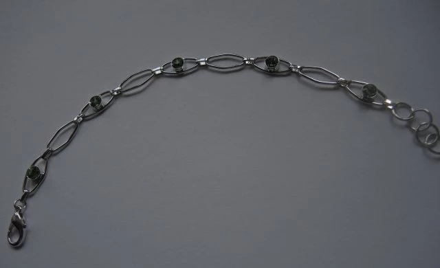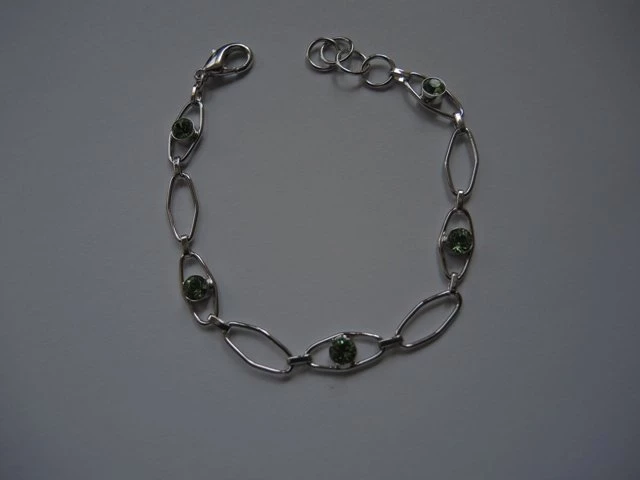 Náramek se Swarovski Elements, rhodium, zelený (peridot), délka 18-20,5cm, šířka 0,8cm, váha 8g, zapínání na karabinu s adjustačním řetízkem, neobsahuje nikl.