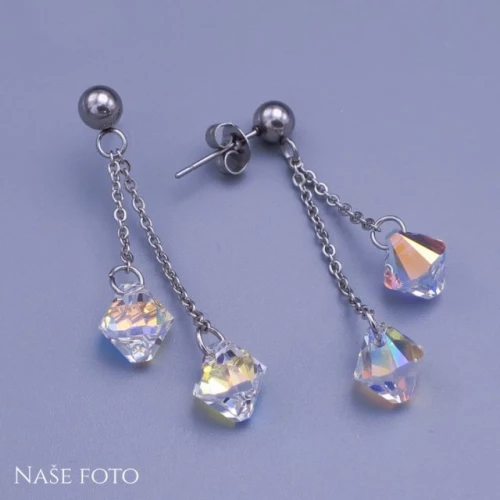 Náušnice jsou složeny s řetízků z chirurgické oceli v šířce 1,2mm na kterých jsou zavěšeny sluníčka 8mm Swarovski v barvě Crystal AB ( měnící ) . Zapínání s kuličkou 5mm na puzetu . Celková délka náušnic: 4cm Chirurgická ocel je vhodná pro alergiky na běžné kovy. P2