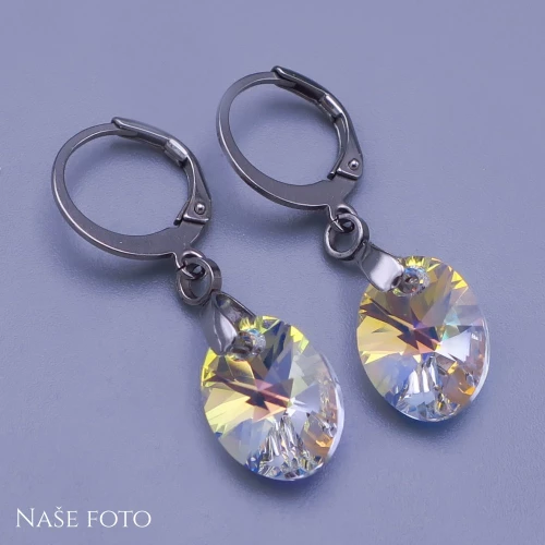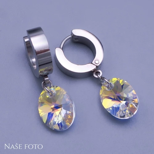 Náušnice Swarovski oválky v barvě Crystal AB ( měnící ) velikosti 12x8mm Na výběr máme zapínání : 1) Visací se zapínáním na klapku - Celková délka náušnic se zapínáním : 30mm 2´) S kroužkem o průměru 12mm a šířce 4mm - Celková délka se zapínáním 30mm Chirurgická ocel je vhodná pro alergiky na běžné kovy . 019
