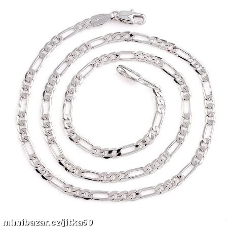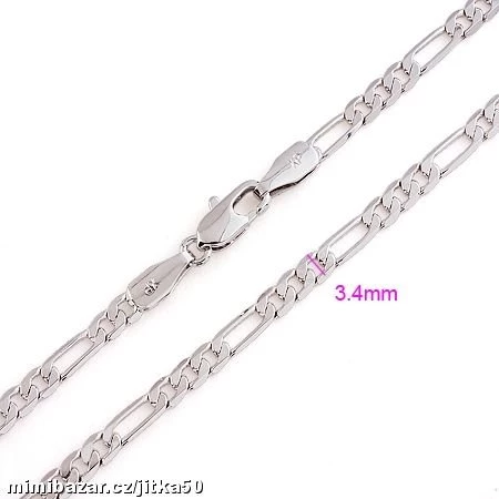 Řetízek porhodiovaný Figaro Rhodium-drahý kov který zajišťuje dlouhodobý lesk,vakuová metoda porhodiování bez mezivrstvy (vzduch je vytlačen) zaručuje dlouhou životnost šperku. rozměry: 450*3,4mm hmotnost: 5.7g Made in Italy. Materiál: Pozlacené 18ti karátovým zlatem