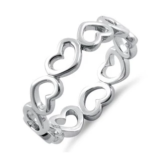 Stříbrný prsten po svém obvodu dekorovaný vyraženým motivem srdíček. Prsten má universální velikost, která lze 2 velikosti zmenšit nebo zvětšit.