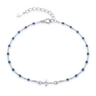 Dámský stříbrný náramek dekorovaný přívěškem ve tvaru křížku a modrými korálky
