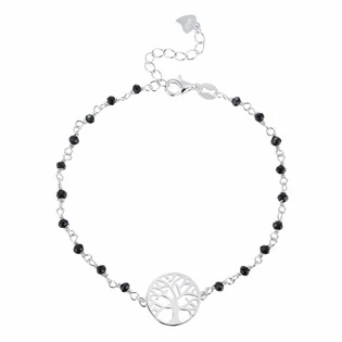 Dámský stříbrný náramek dekorovaný černými korálky a stromem života