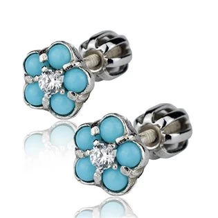 Stříbrné puzetové náušnice se šroubovacím uzávěrem - kytičky tyrkysové Parametry materiál stříbro (Ag 925-1000) povrchová úprava rhodium typ uzávěru šroubovací rozměr kytiček 6 mm hmotnost 2,3 g
