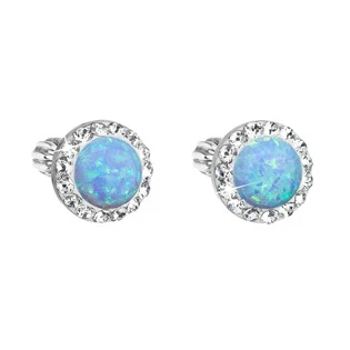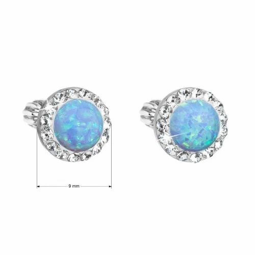 Náušnice typu pecky jsou vyrobeny ze stříbra ryzosti 925/1000 včetně povrchové úpravy rhodiem a je do nich zasazen kulatý syntetický opál zdobený několika odstíny světle modré barvy. Opál se krásně třpytí a hází různě barevné odlesky. Po obvodu jsou navíc kulaté náušnice osázeny bílými Preciosa krystalky. Náušnice se zapínají na balónek, který je spolehlivě ochrání proti jejich ztrátě. Jelikož do šperku není přidán žádný nikl, mohou je s radostí nosit i alergici.