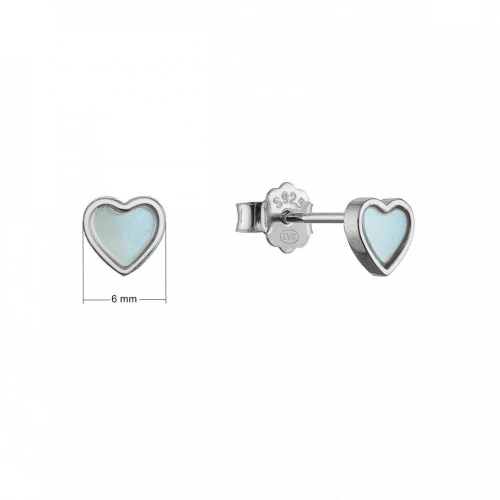 Okouzlující náušnice ve tvaru srdce s puzetovým zapínáním jsou dokonalým doplňkem pro ženy, které milují romantické šperky. Jsou precizně vyplněny perletí, která dodává šperkům nádherný duhový lesk v jemných modrých tónech.
